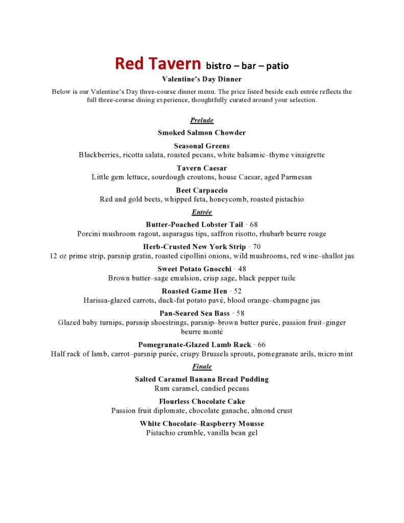 Join us this Valentine’s Day from 4:00–10:00 PM for a delicious three-course dinner. Prices listed next to each entrée reflect the cost of the three-course dinner with that selection. Reservations are highly recommended—please call 530-894-3463 to reserve your table.